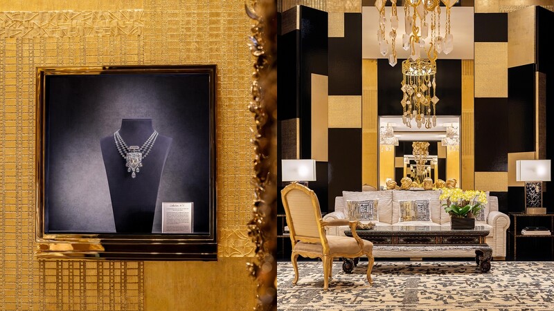 一系列精采的藏品重点包括,VIP包厢(设有拉门能独立空间,与巴黎创意工坊无时差连线、客订作品设计!),沙发背后墙面,委託伊朗裔美国画家 Y.Z. Kami 创作装饰的订製多联拼贴作品;另一侧,法国摄政时期风格的长桌后方镜墙上,订製凿刻青铜古董镜缀以白水晶与波西米亚水晶;美国艺术家Mark Swanson 的水晶鹿雕塑品,呼应香奈儿女士寓所内所收藏的一对鹿雕像;结合陶瓷、镜面、漆包线、木框架及金色花朵缀饰的。