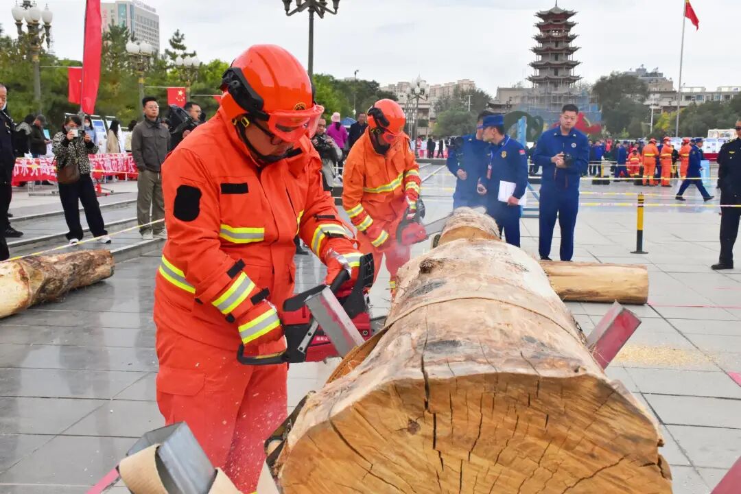 三人协同水泵架设与撤收属于团队协作的极限挑战。“预备——开始!”随着裁判一声令下,三名队员如离弦之箭冲向装备区。队员们配合默契,一人迅速架设水泵底座,另一人麻利地铺设水带,第三人则熟练地连接阀门并启动发动机。一瞬间,一条水龙喷涌而出,精准命中模拟火点。而油锯实操则是“单兵”力量与精准的完美结合。参赛队员稳扎马步,双手紧握油锯,锋利的锯齿在木料上划出笔直的切面,最终,一截平整的圆木应声落地。在这期间,参赛队员必须精准控制力道与角度,每一次下锯都是力量与技巧的较量;每一次收锯,都是速度与稳定的考验。“通过本次技能竞赛,我的应急救援实操能力得到显著提升,团队协作意识进一步强化,不仅深化了对突发事件处置的认知,更积累了应对此类情况的宝贵经验。”赛后,高台县应急管理局主任科员赵建林说。